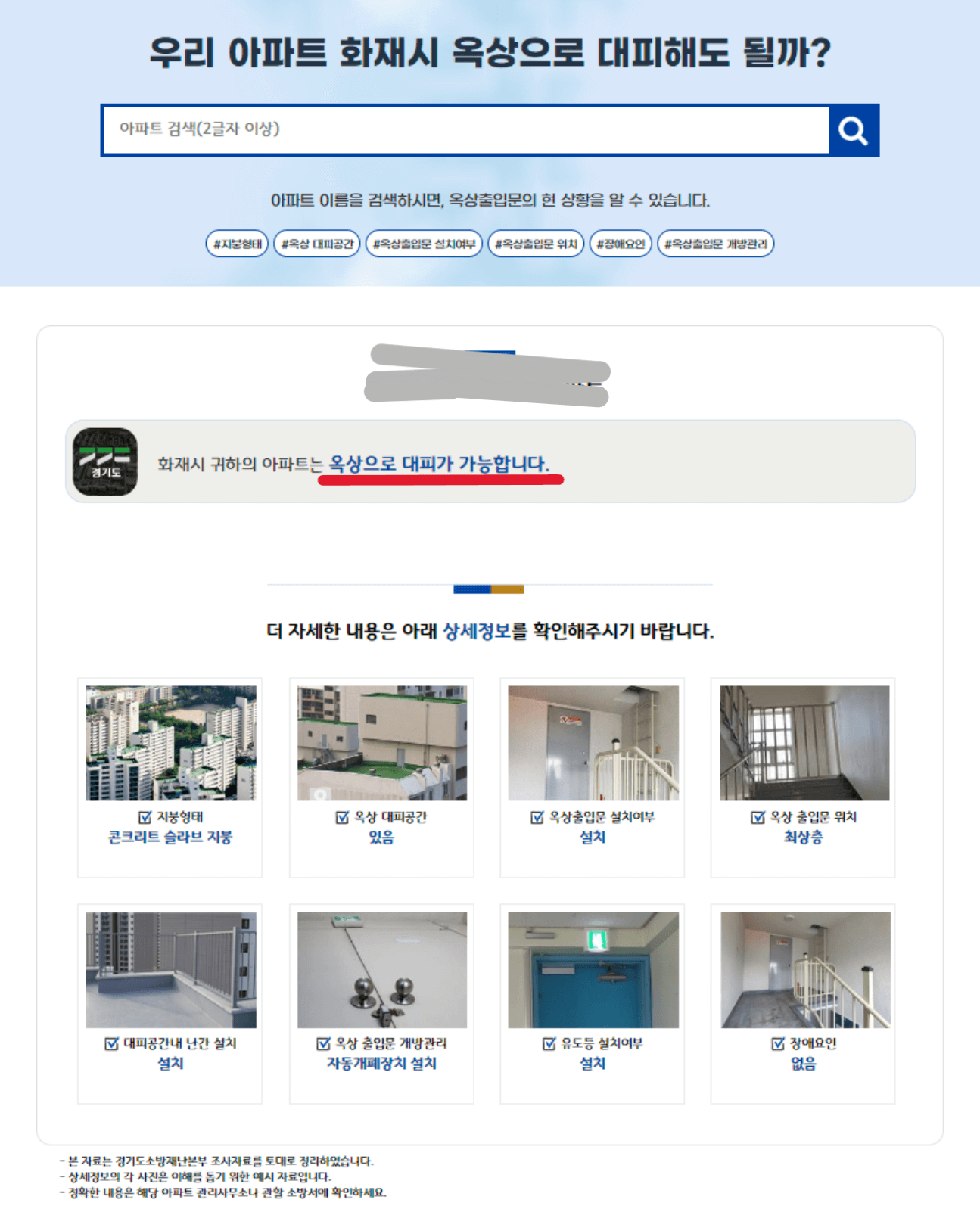 검책창에 아파트명을 입력하면 옥상 출입문 설치 여부와 출입문 위치, 옥상 대피공간, 대피공간 면적, 출입문 개방 상태 등 총 8가지의 정보를 열람할 수 있는 사이트가 있는데요.